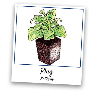 Large plants measure approximately 8-12cm in height from the root of the plant to the top of the stem. Large plants are sold in trays in 12 and 24.